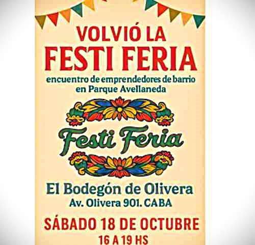 "El bodegón que se encuentra en el corazón de Parque Avellaneda, organiza su famosa “Festi Feria”. Una idea que surge del dueño del bodegón Cristian Díaz Gattuso desde el año pasado con la iniciativa de convocar a los emprendedores del barrio. El sábado 18 de octubre de 16 a 19 hs en la vereda de Olivera.