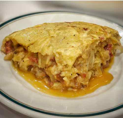 La tortilla lleva, papa, cebolla chorizo candelario, bien española.