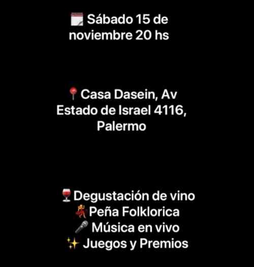 El próximo 15 de noviembre a partir de las 20:00 horas se desarrollará un encuentro para celebrar el Día de la Tradición Argentina - fecha instituida para la celebración de la cultura popular, el gran acervo de música, las comidas, los juegos y costumbres de cada región del país - en Casa Dasein - Av. Estado de Israel 4116 de la Ciudad Autónoma de Buenos Aires -.