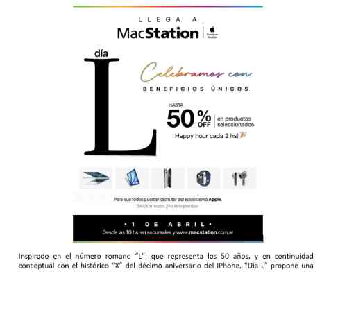 MacStation - principal Apple Premium Reseller de la República Argentina - se suma a los 50 años de Apple con una acción de alto impacto.Se presentará “Día L”, una edición especial que se llevará a cabo el próximo 1 de abril, en su tienda de Riobamba y alcance en todas sus sucursales y su canal online. La propuesta combina beneficios comerciales con una experiencia en vivo pensada para celebrar junto a la comunidad uno de los hitos más importantes de la industria tecnológica.