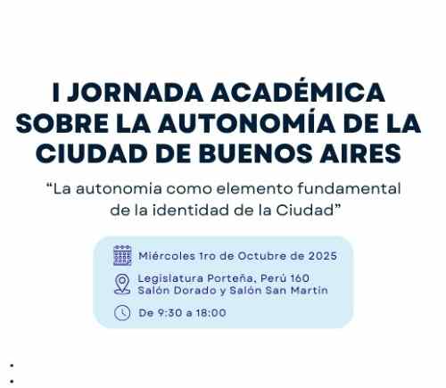 "El próximo miércoles 1 de octubre, en la Legislatura porteña, se llevará a cabo la I Jornada Académica sobre la Autonomía de la Ciudad Autónoma de Buenos Aires, bajo el slogan “La autonomía como elemento fundamental de la identidad de la Ciudad”. El encuentro cuenta con el apoyo de diferentes universidades tales como la Universidad de Buenos Aires, Universidad Austral, Universidad Católica Argentina, Universidad de Morón, Universidad de Belgrano, USAL, UAI, UCES, UMSA, UMAI, UCEMA y UP, entre otras.